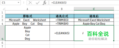 函数TRIM用于删除单词或字符间多余的空格,仅保留一个空格。函数CLEAN则用于删除文本中的换行。两个函数都是用于规范文本书写的函数。 其格式也很简单,为TRIM(需要清洗的单元格)/CLEAN(需要清晰的单元格)