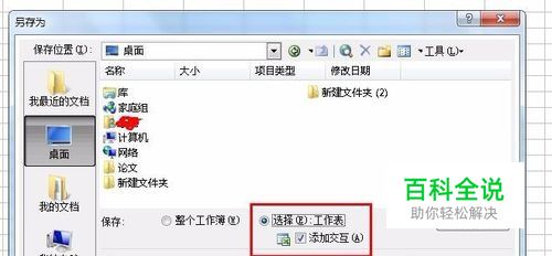 在另存为界面,我们选择存储的地址和文件名字,选择保存工作表,并且勾选添加交互。