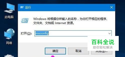看到键盘上的图标:同时按Win键+R,调出“运行”在打开栏,输入msconfig,点击确定,跳出“系统配置”对话框