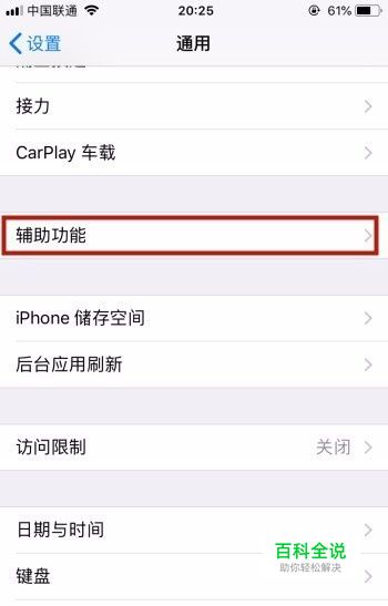 第二步:在通用控制中心,找到辅助功能并点击,如下图所示: