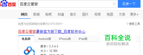 首先在百度上搜索百度云管家,百度一下,点击网页上的下载百度云管家,也可以点击其他链接自行进行下载。