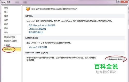 打开word2010,点击“文件”→“选项”→“信任中心”→“信任中心设置”,进入信任中心的选项卡。