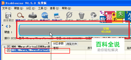 打开DiskGenius软件,在界面的左下方显示了我们系统上的所有硬盘,而图中圈住的就是我们添加的新硬盘。用鼠标选上之后,我们可以在上方柱形图看到已用空间和剩余空间,我添加的硬盘还没有数据,所以显示的是40G空闲。