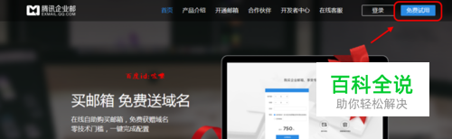 搜索“腾讯企业邮箱”,打开腾讯企业邮申请页面,找到右上角“免费试用”