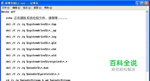 在记事本当中输入: @echo off echo 正在清除系统垃圾文件,请稍等...... del /f /s /q %systemdrive%\*.tmp del /f /s /q %systemdrive%\*._mp del /f /s /q %systemdrive%\*.log del /f /s /q %systemdrive%\*.gid del /f /s /q %systemdrive%\*.chk del /f /s /q %systemdrive%\*.old del /f /s /q %systemdrive%\recycled\*.* del /f /s /q %windir%\*.bak del /f /s /q %windir%\prefetch\*.* rd /s /q %windir%\temp & md %windir%\temp del /f /q %userprofile%\cookies\*.* del /f /q %userprofile%\recent\*.* del /f /s /q "%userprofile%\Local Settings\Temporary Internet Files\*.*" del /f /s /q "%userprofile%\Local Settings\Temp\*.*" del /f /s /q "%userprofile%\recent\*.*" echo 清除系统LJ完成! echo. & pause