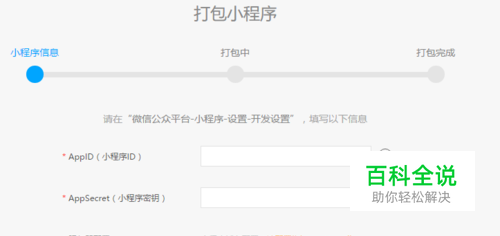 点击页面右上脚的生成,进入打包页面。输入AppID(微信小程序ID)和AppSecret(微信小程序密钥)