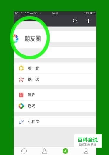 首先打开微信“发现”选项页面,点击“朋友圈”进入;
