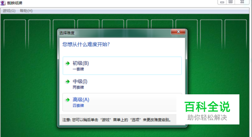 我们从电脑所有程序里进入蜘蛛纸牌,一开始让你选难度,分初级、中级、高级。