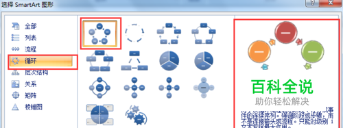 第一步,在【插入】菜单下,找到【smartArt图形】,然后点击一下,就进入了smartArt图形。如图,我选择的是【循环】类的一个图形。