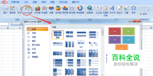 第三步,选择smartArt图形的样式,样式也分为很多种,各种立体的图形也有,选择合适的点击就可以。