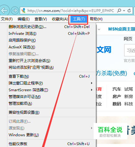 再打开IE浏览器,点击“工具—>Internet选项”,打开Internet选项页面,点击“程序”菜单里“设为默认浏览器”。