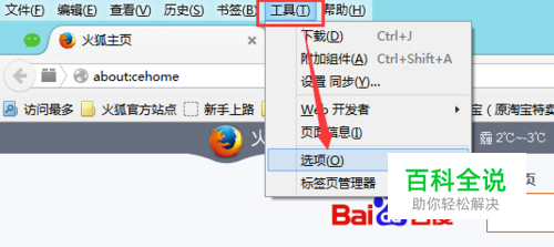 先打开 Firefox 浏览器,点击”工具—>选项“,打开选项页面,点击“高级”菜单里”让Firefox成为默认浏览器“。