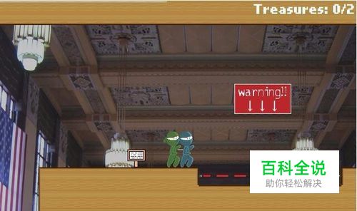 掉下来上爬到柱子上然后慢慢爬到上面拿小白旗,然后下来,跳到柱子的左边的墙上不过要小心然后一个人下去拿宝物,用像拿钥匙一样的方法拿到宝物,也用同样的方法回去,不过趴墙上的人爬高点,不然下面的人一下就进红线了