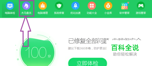 打开电脑的安全卫士,在安全卫士的首页上方的菜单栏中可以看到“木马查杀”,