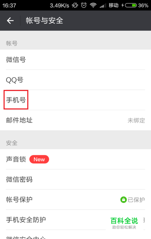 进入“账号与安全”设置后,点击帐号下的“手机号”;
