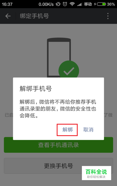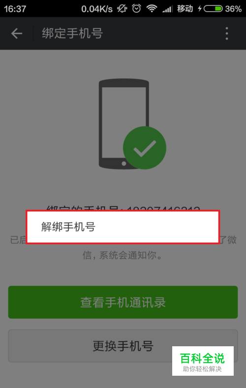 在弹出的菜单上点击“解绑手机号”,弹出解绑确认菜单,点击“解绑”完成解绑手机号,注意该账号至少应该绑定一个QQ号或邮件地址,否则无法解绑手机号;