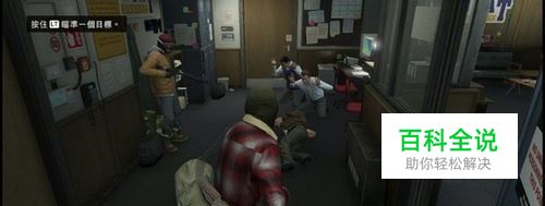 step4.随后三人(还有小布)一起走到保险箱左侧的银行后门的木箱后,随便找“非”正对出口的位置按RB键进入掩体。 然后小布就会到门前安放炸弹,炸开扇门,老崔靠近左侧按动卷闸门开关,三人便可外出(此时不可以换人)。
