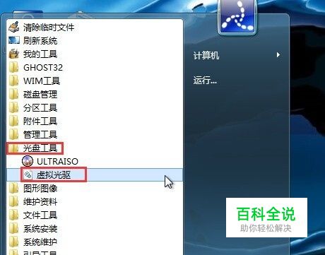 进入PE后,依次点击“开始--光盘工具--虚拟光驱”,如图所示: