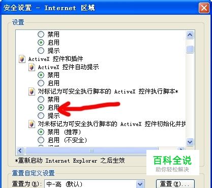 浏览器的ActiveX控件执行脚本未启用。 首先打开浏览器,点击工具--internet选项--安全--自定义级别--对“对标记为可安全执行脚本的ActiveX控件执行脚本”设置为“启用”