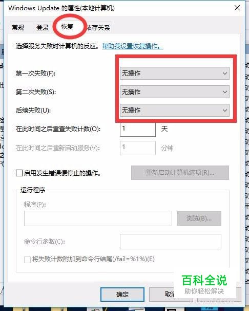 3、设置服务属性:启动类型——禁止;恢复:第一次——无操作,第二三次也选择——无操作,点击确定即可。