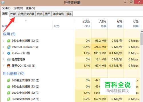 进入到任务管理器面板后,我们点击面板上方的”性能“。
