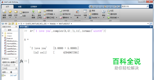 第一,直接{ }赋值法。在命令行窗口输入如代码: A={'I love you',complex(3,5);{1,11},intmax('uint32')} 这样就直接创建了元胞数组A,元胞数组A将字符型,复数型,元胞数组型,整型常量等放在同一个存储单元,回车得到如下结果: A = 'I love you' [3.0000 + 5.0000i] {1x2 cell} [ 4294967295]