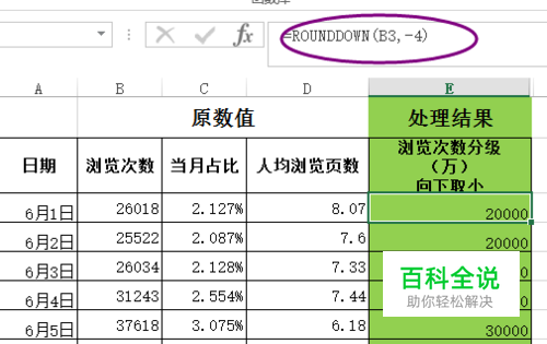 2、rounddown函数 它是将一个数字向下舍入取值,返回的结果绝对值<=原数值的绝对值。它可以通过定义参数的正负数来决定保留小数点还是保留非小数点的数; 如rounddown(152.3651,2),指向下舍入保留2位数,是将第三位数及以下的数都去掉的结果,rounddown(152.3651,2)=15.36,不考虑第三位是否超过“5”;当参数为负数的是同样采用例子rounddown(152.3651,-2),它是保留百位及以上的数值,十位数即以下位数都为0,即rounddown(152.3651,-2)=100;
