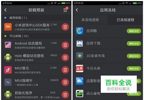 四、明确手机耗电软件后,你有选择删除或冻结它们吗? 在知道是哪些软件在耗电后,你的选择是什么呢?任它们继续作恶还是删除部分还是全部删除呢? 这里,应该删除部分的居多吧,因为小编发现有一些内置的应用软件,小编我没法轻易删除它们。 如何删除、冻结应用: 小编发现使用上面提到的省电大师的卸载预装和应用冻结功能就可以帮你轻松解决这个问题。 1、你可以直接进入预装管理界面,轻松删除这些又耗电又占内存的预装软件。 2、你可以直接进入应用冻结界面,有效冻结你想关闭的应用。