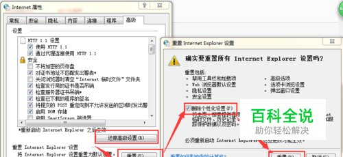 点击【重置】--在弹出窗口勾选【删除个人设置】-点击【重置】重置完成后点击确定,关闭重新打开浏览器测试即可。
