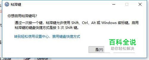 连续快速地敲击shift键5次,将会弹出粘滞键窗口,窗口中间有一个蓝色字体,我们需要点击他。
