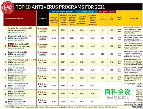 Kaspersky反病毒2011(40美元/台/年) 优点:顶级恶意软件检测和拦截性能,用户界面简单整洁; 缺点:启动速度和文件复制较慢,对系统性能存在一定程度影响; 总评:Kaspersky反病毒2011是一款非常有效的安全软件产品,在机器配置允许的情况下,推荐使用。
