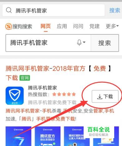 打开搜狗搜索,搜索腾讯手机管家,将其下载安装到手机上面。