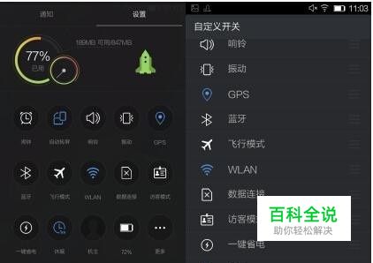 第二步:在S5.1的下拉通知栏界面中,长按某一功能图标即可快速进入设置。向左滑动,可以看到功能丰富的快捷操作栏,快捷启动开关还支持自定义,点击“更多”后可以将各个快捷启动开关的排列顺序进行更改。顶部带有一键加速功能,点击火箭即可快速清理。快捷方式下面,还有亮度调节的径度条,可以快速调节亮度