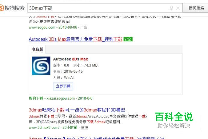进入之后,在搜索框中填入“3Dmax下载”,点击搜索进入搜索结果页面,如图所示。