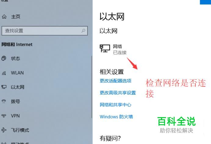 首先要检查的就是网络连接了,在win10中我们需要打开以太网连接,查看连接状态是否正常,如下图所示