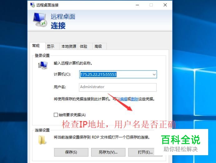 接下来我们需要打开远程桌面连接,检查连接地址,用户名是否书写正确,如下图所示