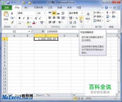 1.在“开始”功能区设置千位分隔符数字格式 在Excel2010工作簿窗口“开始”功能区中设置千位分隔符数字格式的步骤如下所述: