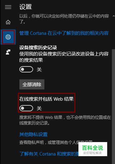 方法二:关闭Cortana(小娜助手)在线搜索功能。 点击任务栏的Cortana(小娜助手)搜索框,在弹出的窗口点击“设置”,然后将“在线搜索并包括web结果”关闭,如图所示: