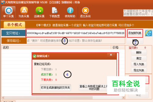 然后按照工具的使用帮助,复制自己要的宝贝描述的宝贝链接,粘贴到我们工具采集地址栏,点添加列表,然后点生成数据包。如图: