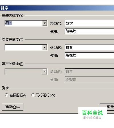 点击排序按钮,弹出一个排序面板。 在“主要关键字”这里已默认显示为:列1;也就是表格中的A列。 在“类型”这里选择:数字 点选:升序