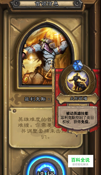 英雄模式下,BOSS技能如下图,“菲利克斯控制了权杖,获得免疫”,这个BOSS控制权杖的时候是一个3/8的权杖,相当于一个3/8的随从,BOSS自身还免疫任何攻击,而玩家控制法杖的时候是0/5,且自身不带任何免疫……说简单点,别想着跟BOSS抢权杖,这玩意儿对你没用,你只要在5费前把权杖沉默,然后毁掉。所以要用到的英雄是,牧师。(这BOSS用牧师真是好打)