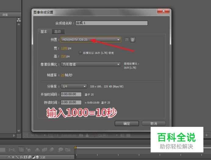 新建一个工程文件,创建一个新的合成组。(Ctrl+N) 在新弹出的合成组上,设定预置为HDV/HDTV 720。(持续时间设为:10秒)