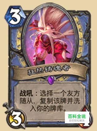 狂热铸魂者,小编本身比较喜欢的牌,首先身材在3费没得说,特效可以复制一张卡到牌库,一般能复制自己的有威胁怪让它有再上场的机会,在控场法师中有一定的作用。