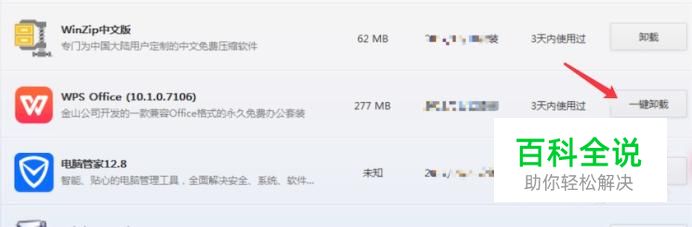 我们需要先卸载wps,在电脑管家里找到这个wps,点击‘一键卸载’。