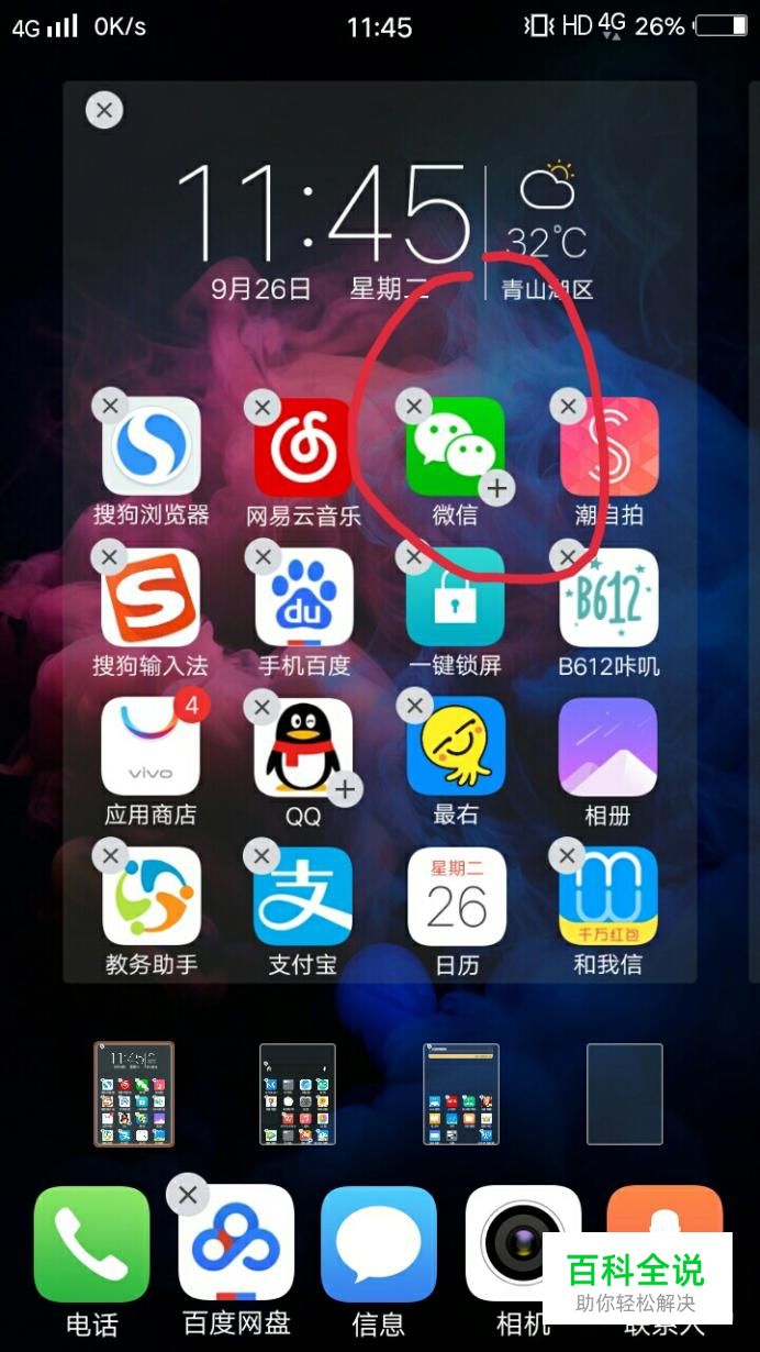 然后两三个手指往下滑, 在界面的上方会出现一排其他的软件,然后任意点击其中的一个,以微信为例。