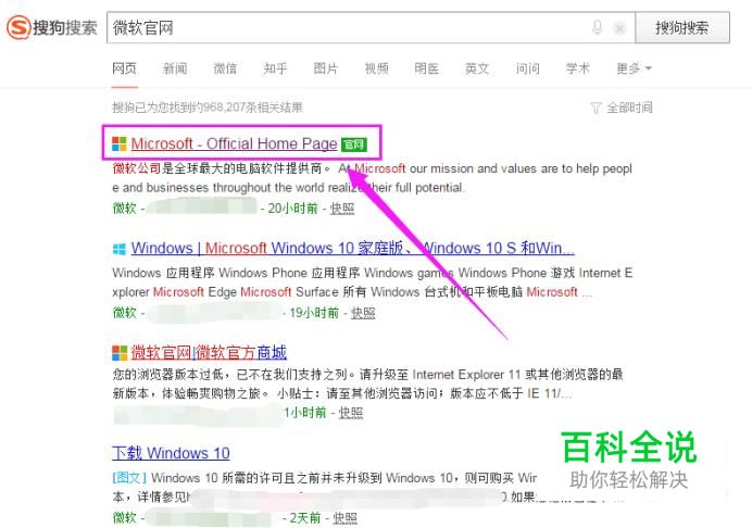 我们打开浏览器,在浏览器中输入“微软官网”,如图所示。