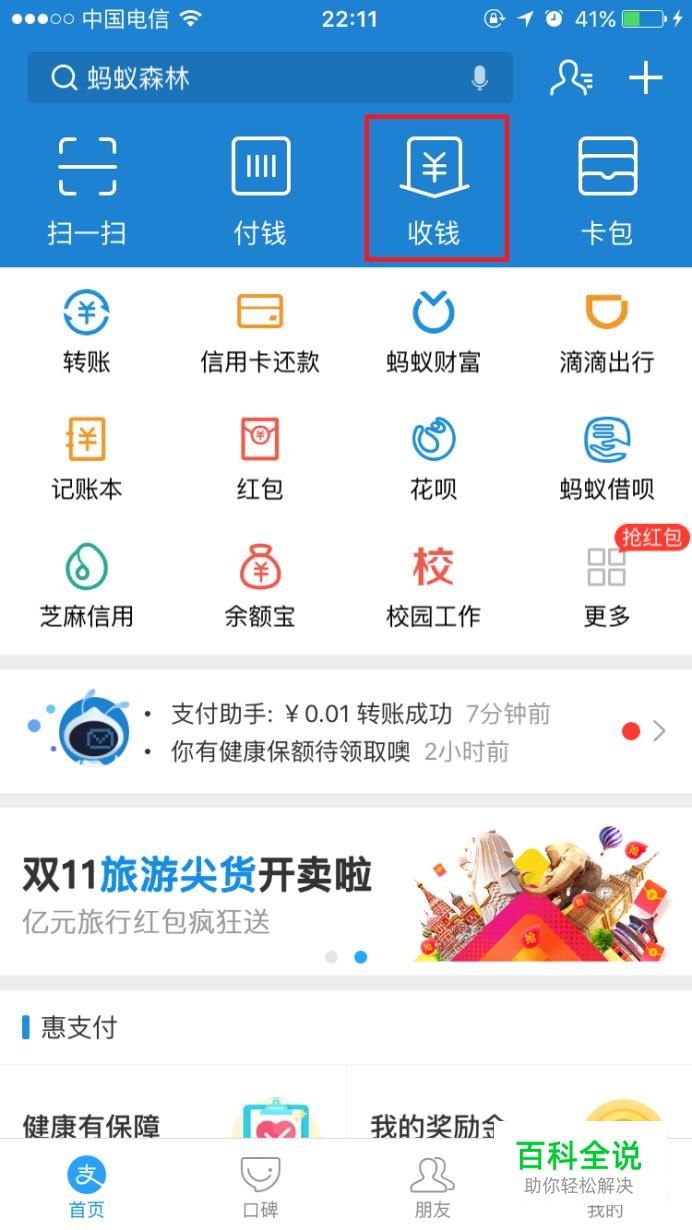 进入支付宝首页,点击“收钱”。