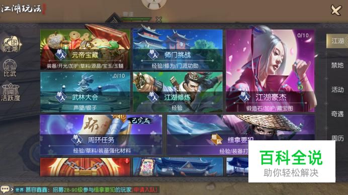 进入江湖列表界面,我们点击“江湖豪杰”进入,完成活动能够获得藏宝图,每日能完成10次。