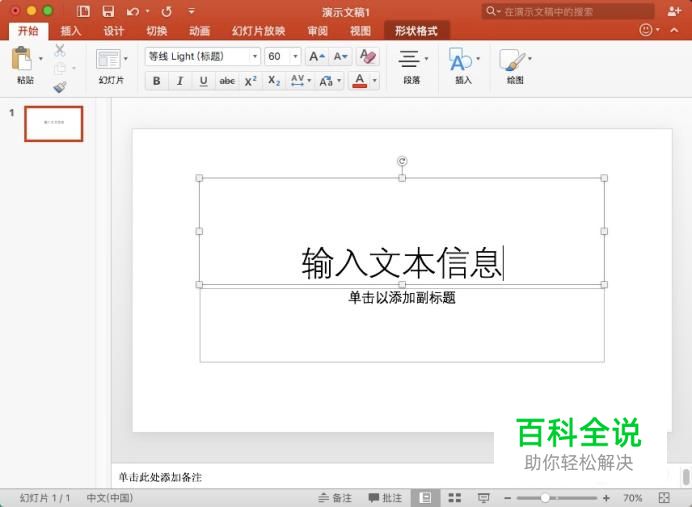 进入PPT界面,默认的幻灯片是白色的,双击文本框可以输入文本信息进行添加。