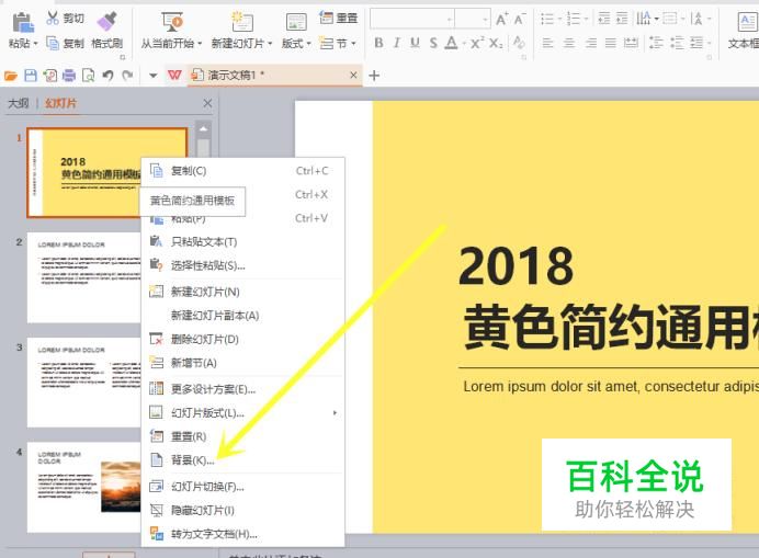 然后选择一张PPT,点击鼠标右键弹出设置窗口,然后再用鼠标左键点击 背景
